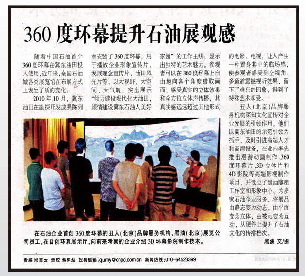 黑油數(shù)字展覽(北京)品牌服務(wù)機(jī)構(gòu)深知文化宣傳對(duì)企業(yè)發(fā)展的引領(lǐng)作用。他們以冀東油田的示范引領(lǐng)為抓手,及時(shí)引進(jìn)高端人才和高清設(shè)備,在業(yè)內(nèi)率先推出漫游動(dòng)畫(huà)制作、360度環(huán)幕片、3D立體片和4D影院等高端影視制作項(xiàng)目,并設(shè)立了黑油雕塑工作室和形象中心,為多家石油企業(yè)服務(wù),將展品由靜態(tài)變?yōu)閯?dòng)態(tài),由平面變?yōu)榱Ⅲw,由被動(dòng)變?yōu)榛?dòng),從硬件上提升了石油文化的傳播檔次。